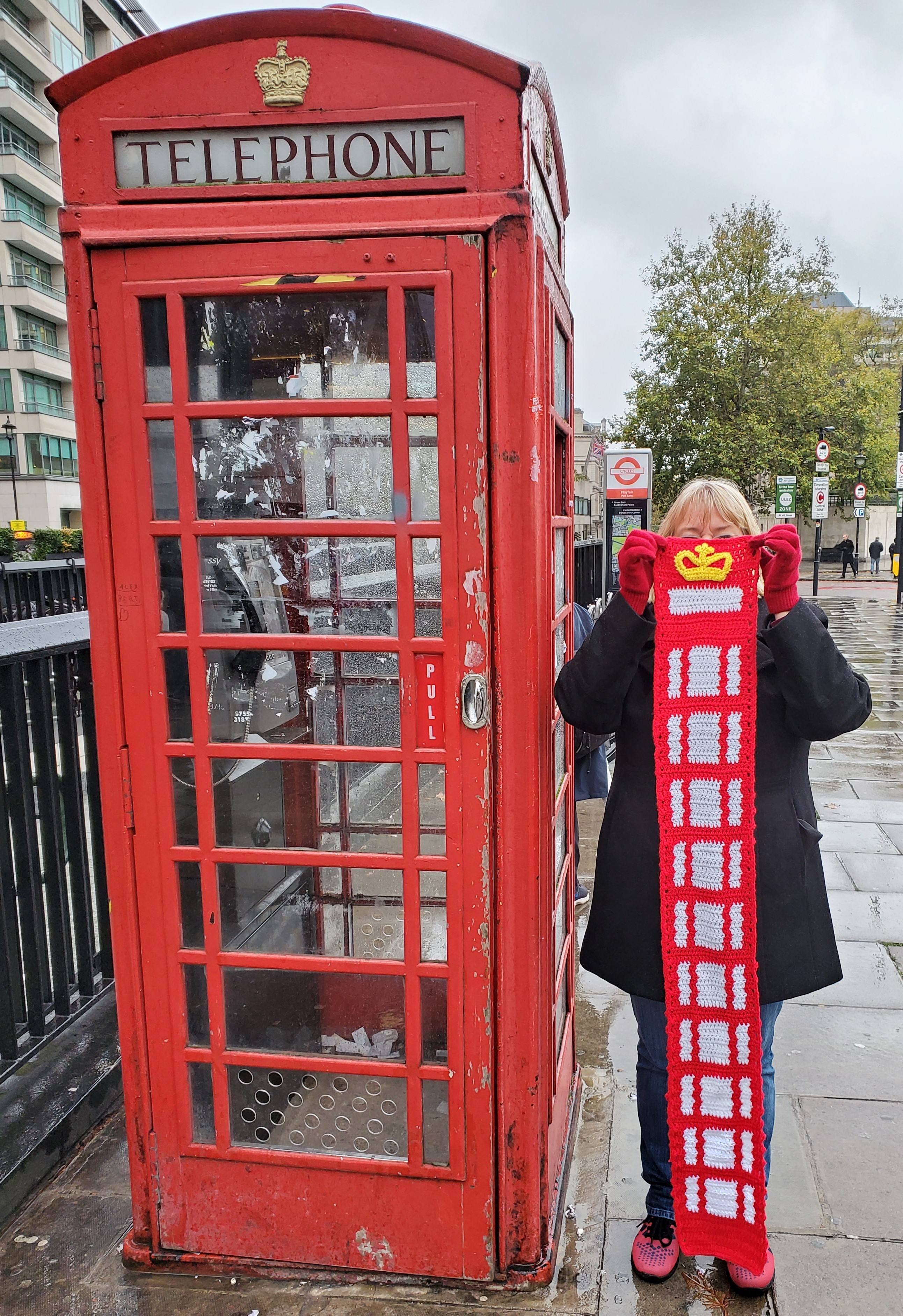 Since my first visit to London last year, I have been toying with the idea of a scarf made to look like the phone booths scattered around London. For this trip, I just had to make one and get a photo.